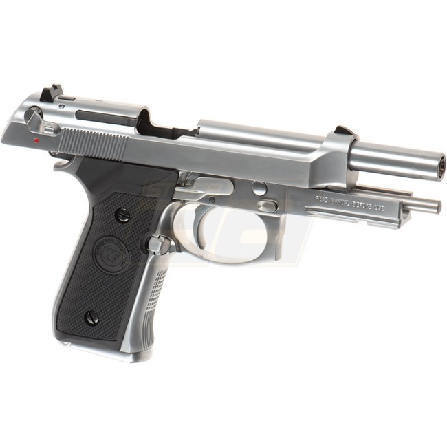 WE M9A1 V2 Gas Blow Back Pistol - Silver: Metal / Polymer, 25rd magazine, 215mm length, 890g weight, 109mm inner barrel, 320-340 FPS, Semi Auto, Adjustable hop up. Comes with gun and magazine.