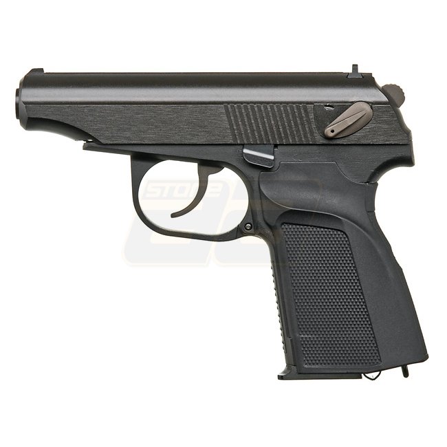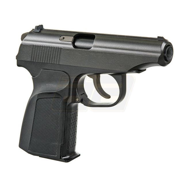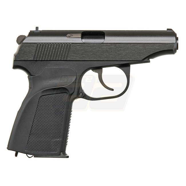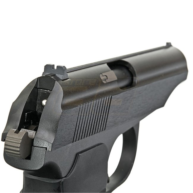 WE Makarov Gas Blow Back Pistol - Black: Metal and plastic construction, 16rd magazine, 161mm length, 635g weight, 50mm inner barrel, 280-300 FPS, Semi Auto, 38.41-41.16m shooting range, adjustable Hop Up. Package includes gun, magazine, silencer dummy, b