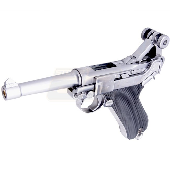 A sleek and powerful gas blow back pistol in silver finish, WE P08 4 Inch is a semi-auto gun with adjustable hop up. Comes with a 15-round (6mm) magazine, measuring 219mm in length and weighing 830g. Ideal for shooting ranges from 39.79-42.53m.