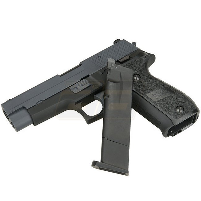 WE P226 Gas Blow Back Pistol in Black color. Metal and plastic grip cover. 21 round magazine capacity. 197mm length. 880g weight. 95mm inner barrel length. Muzzle velocity of 280-300 FPS. Semi Auto shooting mode. Adjustable hop up. Includes gun and magazi