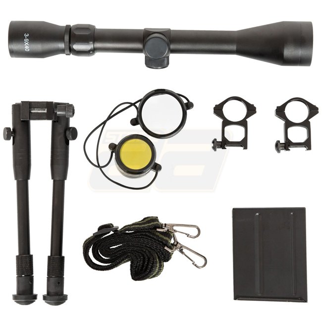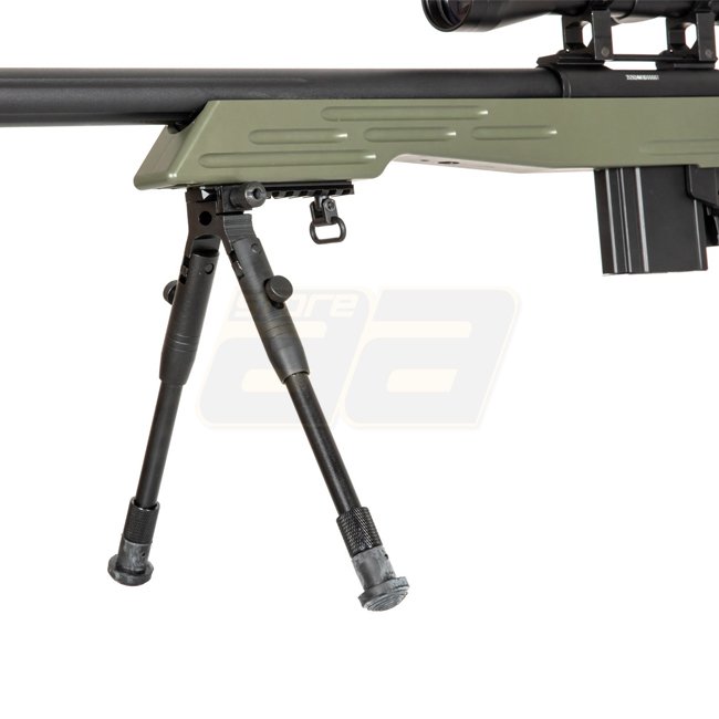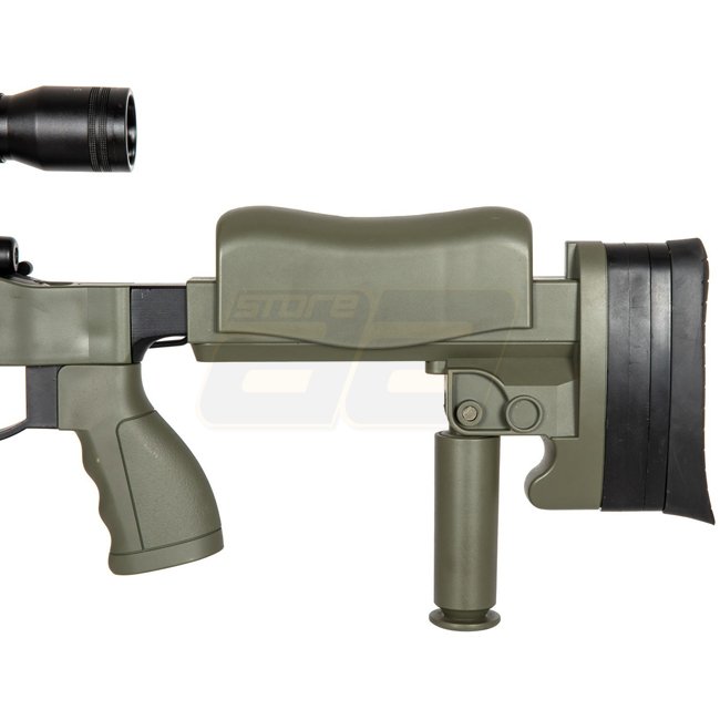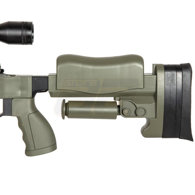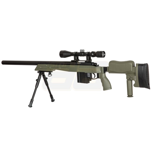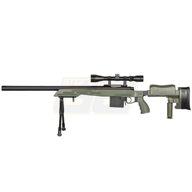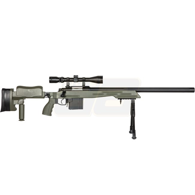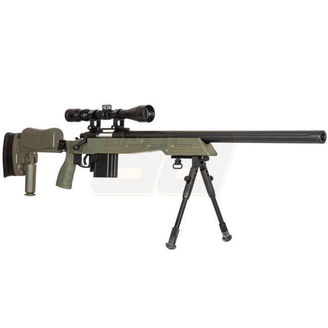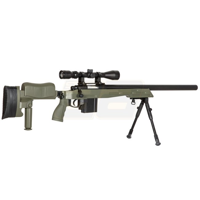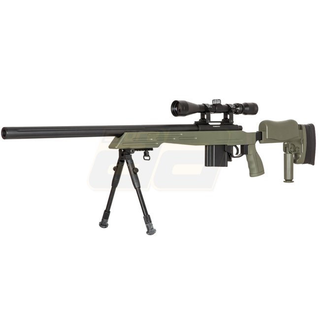 This olive Well MB4413D Sniper Rifle Set includes a spring system, metal/polymer stock, 30-round magazine, and a shooting range of 60.37-63.11m.