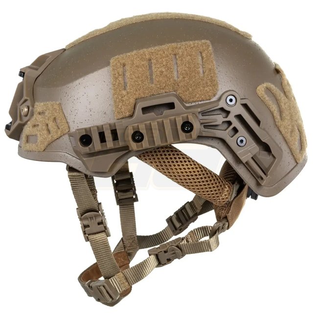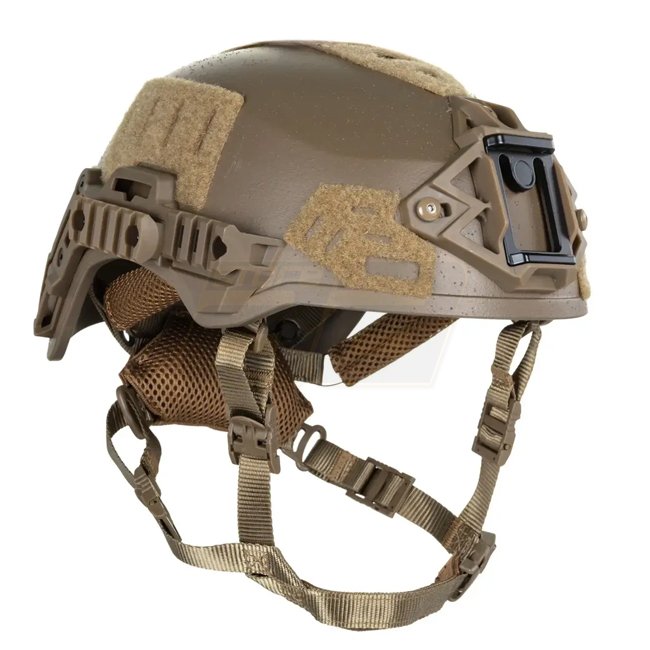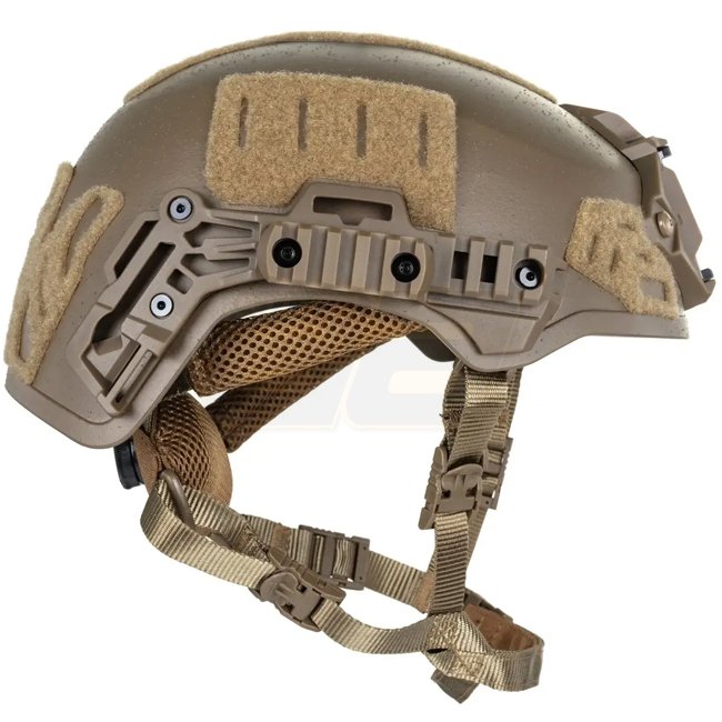 The Wosport EX HL‑103 replica helmet features a durable ABS shell with a matte, textured finish to minimise glare. An adjustable fit knob ensures a secure fit, with multiple foam cushions for comfort during extended wear. It includes side rails for mounting accessories, a front mount for NVG devices, and large Velcro areas for patches or markers.